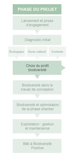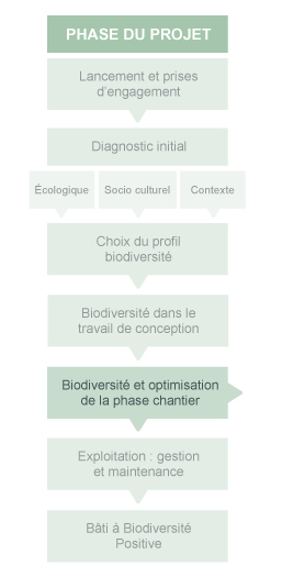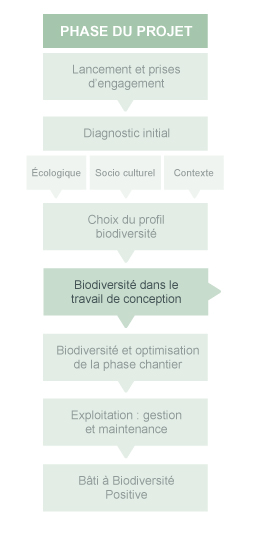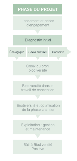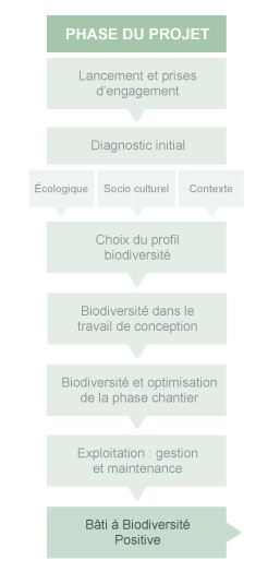 Les démarches de certifications environnementales prennent souvent en compte la biodiversité de manière indirecte, comme c'est le cas de la démarche HQE®. La démarche présentée ci-dessous va vous permettre d'améliorer la performance de votre projet pour ces critères. Elle facilite la prise en compte de la biodiversité pour les étapes de la démarche HQE® mais pourra également être appliquée dans d'autres contextes. Pour connaître les cibles qui pourront être améliorées, vous pouvez consulter la rubrique " comparaison de la prise en compte de la biodievrsité dans les principales démarches actuelles".