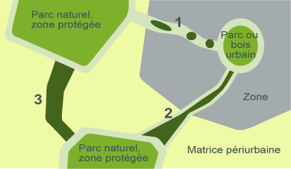 ![]() | 1 Pas japonais : jardins privés, petits squares, portions de haies… 2 Petit corridor urbain et périurbain : chemins de promenades verts, aménagement des bords de routes et de canaux, des délaissés de chemins de fers, bandes enherbées… 3 Grand corridor vert uniforme ou non (forêt, bords de rivière, bandes enherbées…) Zone tampon, de transition : activités humaines compatibles avec la restauration et la conservation de la biodiversité. | |