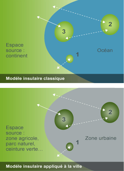 Les îles sont isolées des continents par l’océan. La colonisation se fait soit par le vol (oiseaux), soit par l’envoi de propagules par le vent ou l’eau. La théorie de MacArthur et Wilson affirme que le nombre d’espèces sur une île, dépend de sa proximité au continent et de sa capacité biologique (grande taille et compétition interspécifique faible).
